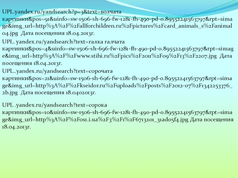UPL .yandex.ru/yandsearch?text=сорока картинки&pos=10&uinfo=sw-1506-sh-696-fw-1281-fh-490-pd-0.89552241563797&rpt=simage&img_url=http%3A%2F%2Fos1.i.ua%2F3%2F1%2F6713201_31ad05f4.jpg Дата посещения 18.04.2013г.