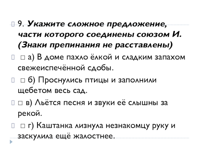 9. Укажите сложное предложение, части которого соединены союзом И. (Знаки препинания не расставлены) □ а) В доме