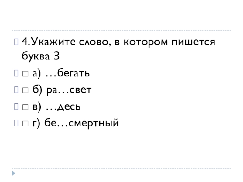4.Укажите слово, в котором пишется буква З □ а) …бегать □ б) ра…свет □ в) …десь □