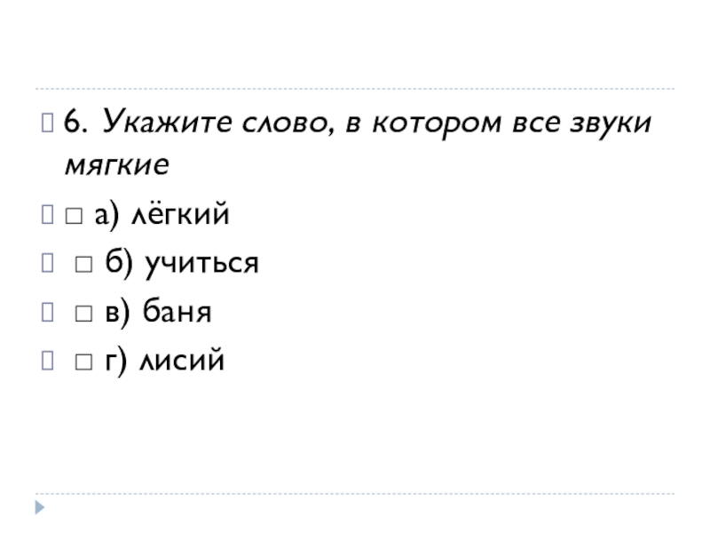 6. Укажите слово, в котором все звуки мягкие □ а) лёгкий □ б) учиться □ в) баня