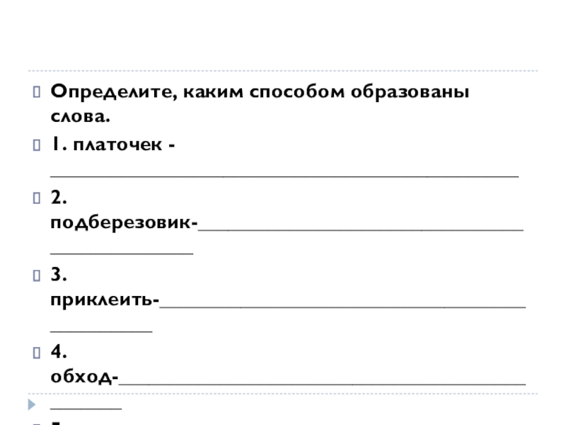 Определите, каким способом образованы слова.1. платочек - ______________________________________________2. подберезовик-______________________________________________3. приклеить-______________________________________________4. обход-_______________________________________________5.ФСБ_________________________________________