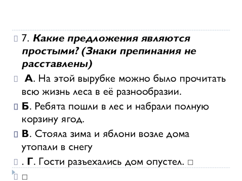 7. Какие предложения являются простыми? (Знаки препинания не расставлены) А. На этой вырубке можно было прочитать всю