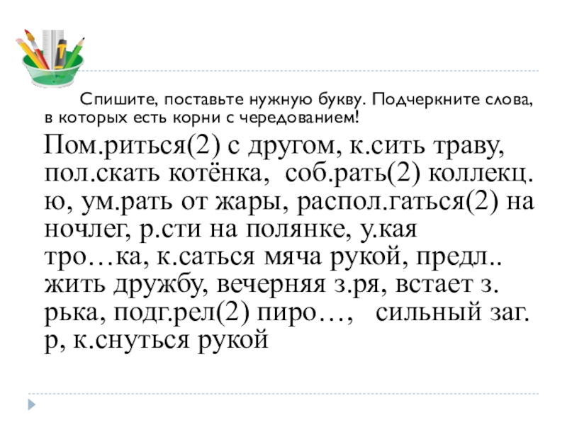Спишите, поставьте нужную букву. Подчеркните слова, в которых есть корни с чередованием! Пом.риться(2) с другом, к.сить траву, пол.скать котёнка, соб.рать(2) коллекц.ю, ум.рать от жары, распол.гаться(2) на ночлег, р.сти на полянке,