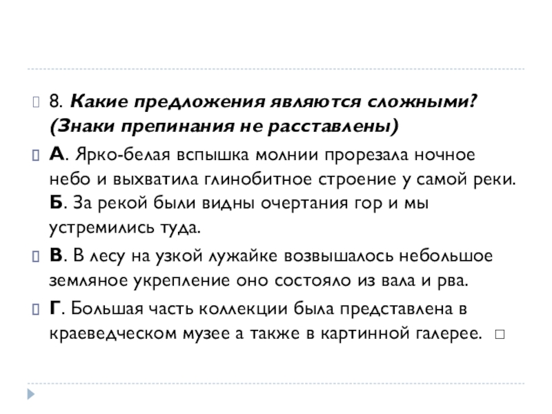 8. Какие предложения являются сложными? (Знаки препинания не расставлены) А. Ярко-белая вспышка молнии прорезала ночное небо и