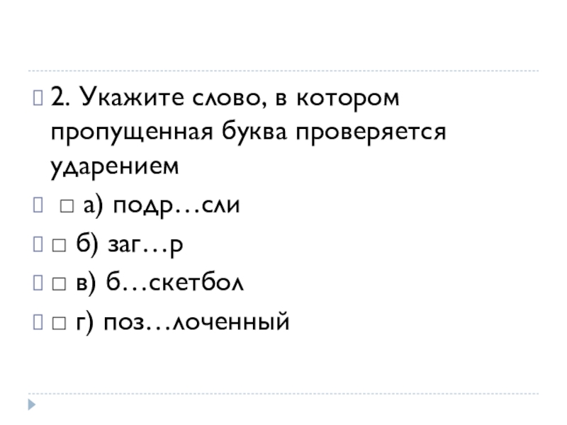 2. Укажите слово, в котором пропущенная буква проверяется ударением □ а) подр…сли □ б) заг…р □ в)