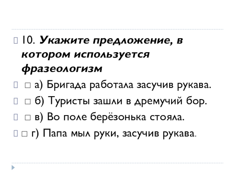 10. Укажите предложение, в котором используется фразеологизм □ а) Бригада работала засучив рукава. □ б) Туристы зашли