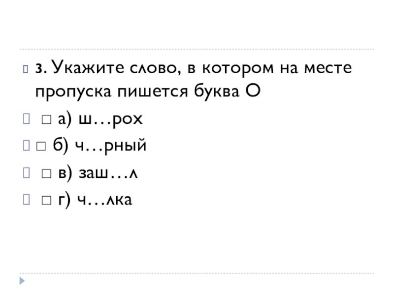3. Укажите слово, в котором на месте пропуска пишется буква О □ а) ш…рох □ б) ч…рный