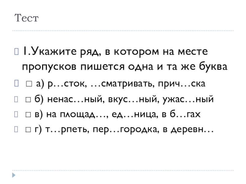 Тест 1.Укажите ряд, в котором на месте пропусков пишется одна и та же буква □ а) р…сток,