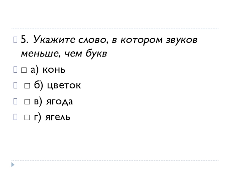 5. Укажите слово, в котором звуков меньше, чем букв □ а) конь □ б) цветок □ в)