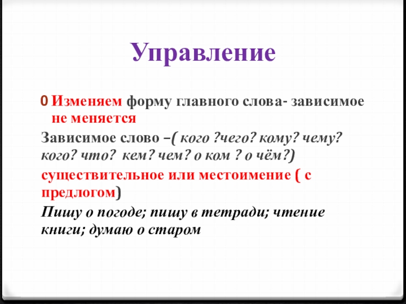 УправлениеИзменяем форму главного слова- зависимое не меняетсяЗависимое слово –( кого ?чего? кому? чему? кого? что? кем? чем?