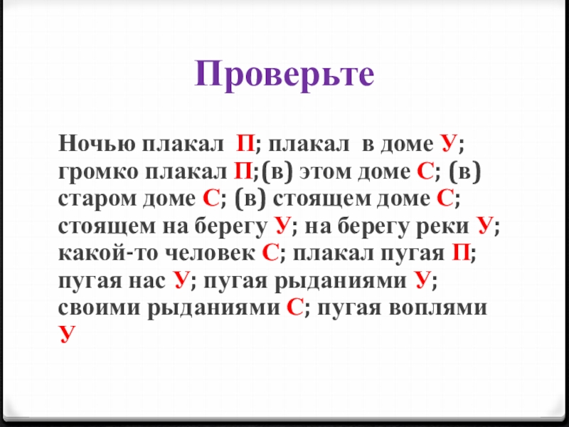 доме С; (в)старом доме С; (в) стоящем доме С; стоящем на берегу У; на берегу реки У; какой-то человек С; плакал пугая П; пугая нас У; пугая рыданиями У; своими рыданиями С; пугая воплями У