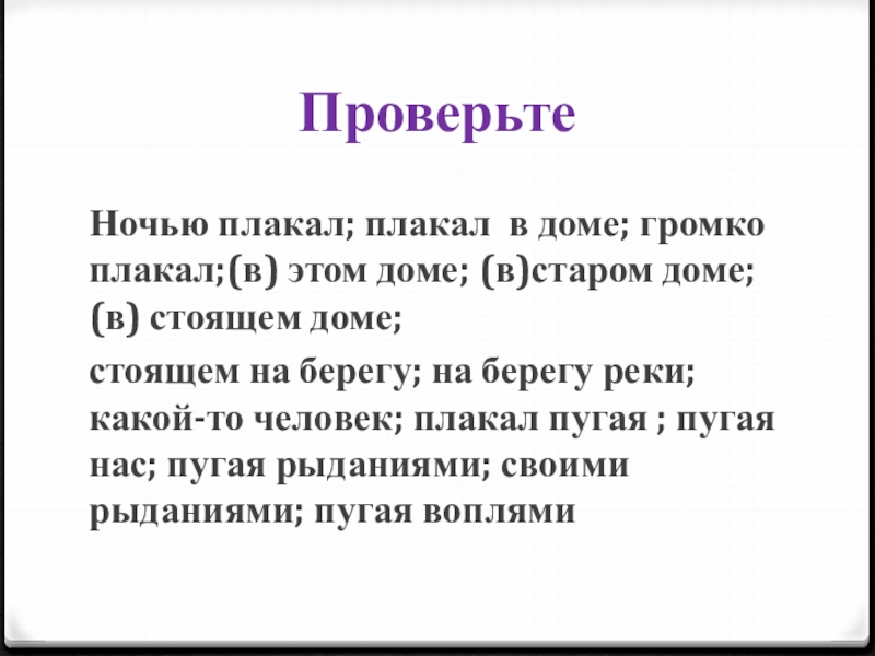 ПроверьтеНочью плакал; плакал в доме; громко плакал;(в) этом доме; (в)старом доме; (в) стоящем доме;стоящем на берегу; на