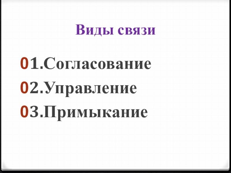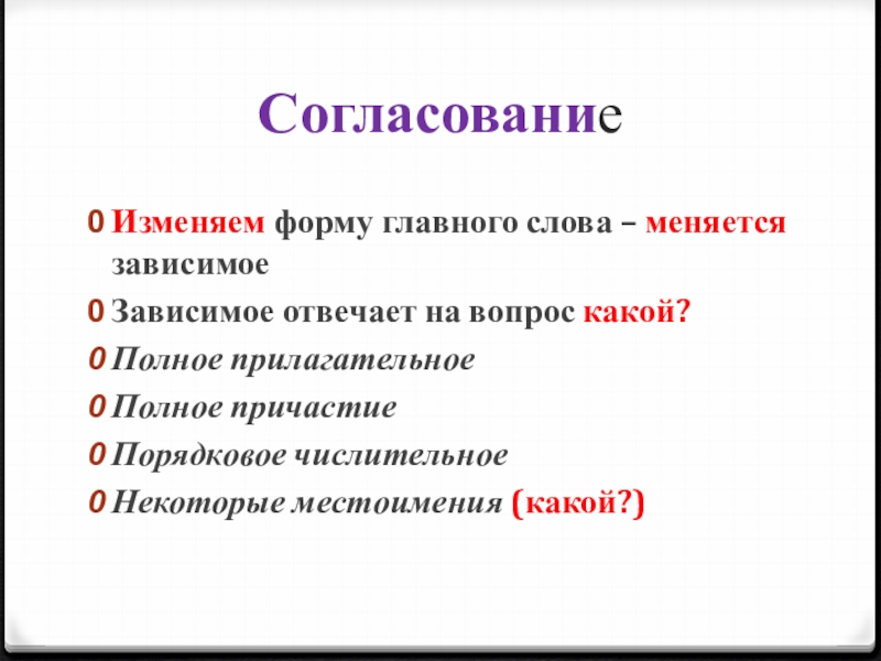 СогласованиеИзменяем форму главного слова – меняется зависимоеЗависимое отвечает на вопрос какой?Полное прилагательноеПолное причастиеПорядковое числительноеНекоторые местоимения (какой?)
