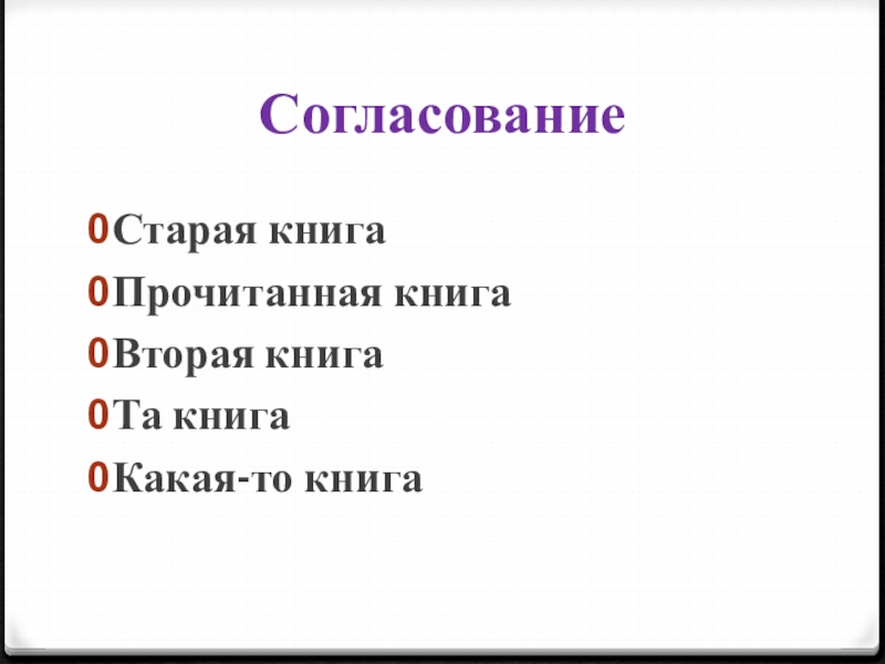 Согласование Старая книгаПрочитанная книгаВторая книгаТа книгаКакая-то книга