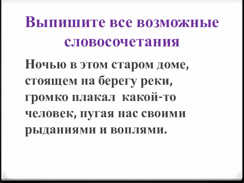 Выпишите все возможные словосочетанияНочью в этом старом доме, стоящем на берегу реки, громко плакал какой-то человек, пугая