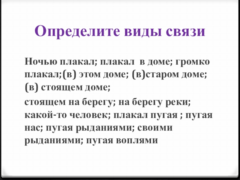 Определите виды связиНочью плакал; плакал в доме; громко плакал;(в) этом доме; (в)старом доме; (в) стоящем доме;стоящем на
