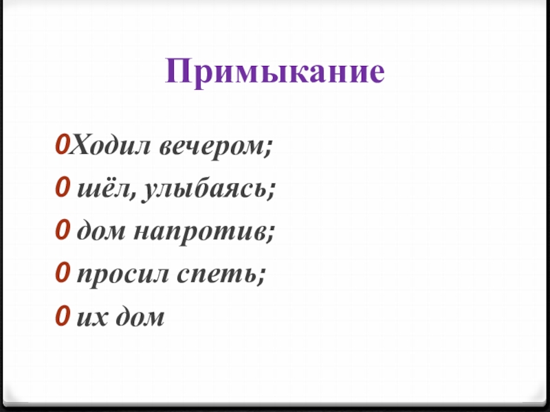 ПримыканиеХодил вечером; шёл, улыбаясь; дом напротив; просил спеть; их дом