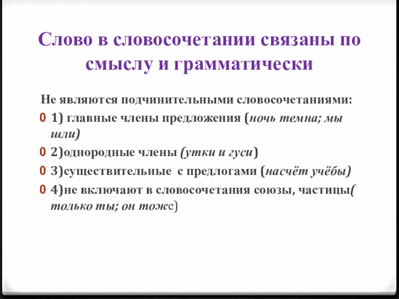 Слово в словосочетании связаны по смыслу и грамматическиНе являются подчинительными словосочетаниями:1) главные члены предложения (ночь темна; мы