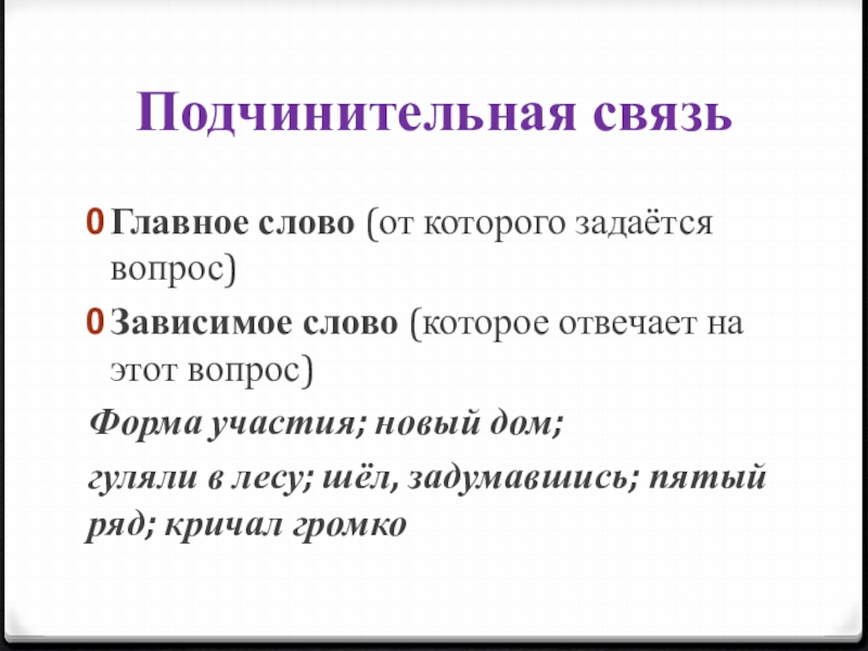 Подчинительная связьГлавное слово (от которого задаётся вопрос)Зависимое слово (которое отвечает на этот вопрос)Форма участия; новый дом;гуляли в лесу; шёл, задумавшись; пятый ряд; кричал громко