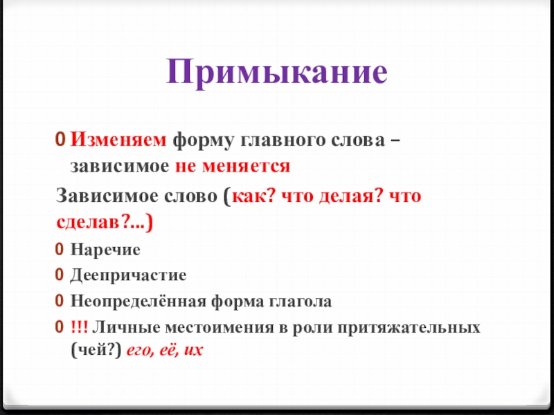 ПримыканиеИзменяем форму главного слова – зависимое не меняетсяЗависимое слово (как? что делая? что сделав?...)НаречиеДеепричастиеНеопределённая форма глагола!!! Личные