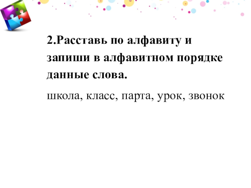 Слайд 42.Расставь по алфавиту и запиши в алфавитном порядке данные слова.