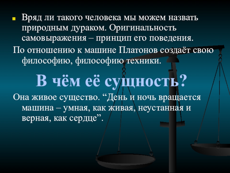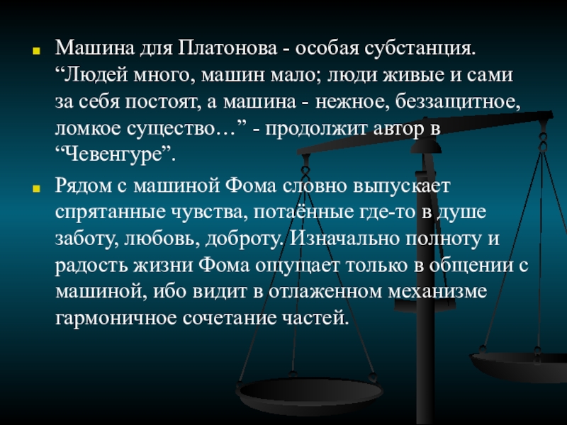 Слайд 13Машина для Платонова - особая субстанция. “Людей много, машин мало; люди