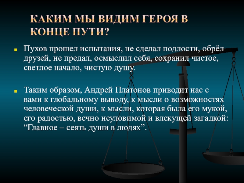 Слайд 15Пухов прошел испытания, не сделал подлости, обрёл друзей, не предал, осмыслил