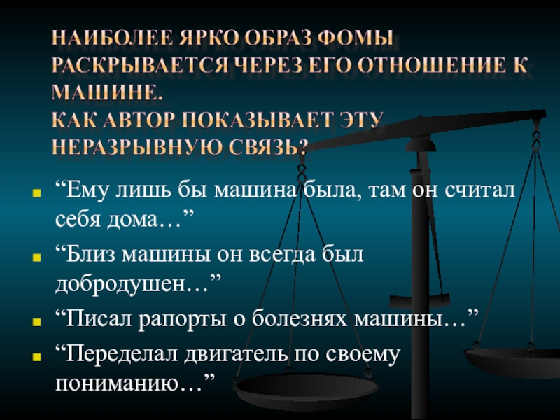 Рядом с машиной Фома словно выпускает спрятанные чувства, потаённые где-то в душе заботу, любовь, доброту. Изначально полноту и радость жизни Фома ощущает только в общении с машиной, ибо видит в отлаженном механизме гармоничное сочетание частей.