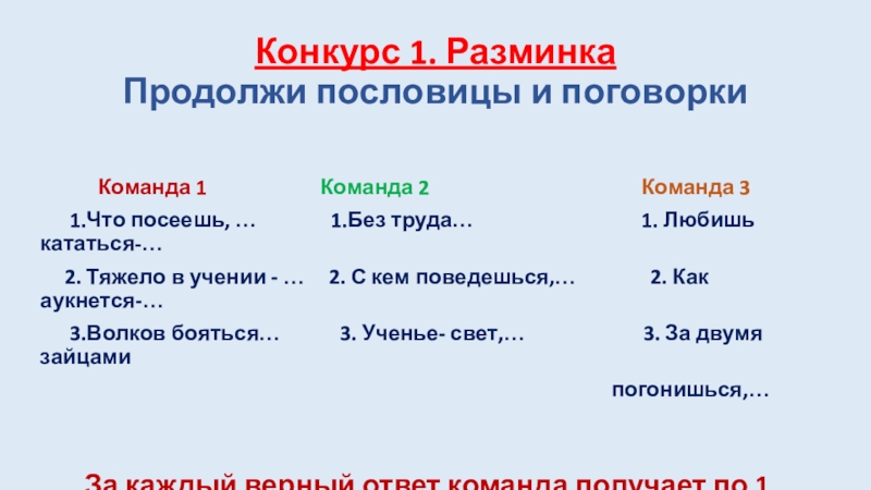 2. Тяжело в учении - … 2. С кем поведешься,… 2. Как аукнется-…
