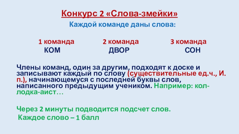 Члены команд, один за другим, подходят к доске и записывают каждый по слову (существительные ед.ч., И.п.), начинающемуся с последней буквы слов, написанного предыдущим учеником. Например: кол-лодка-аист…