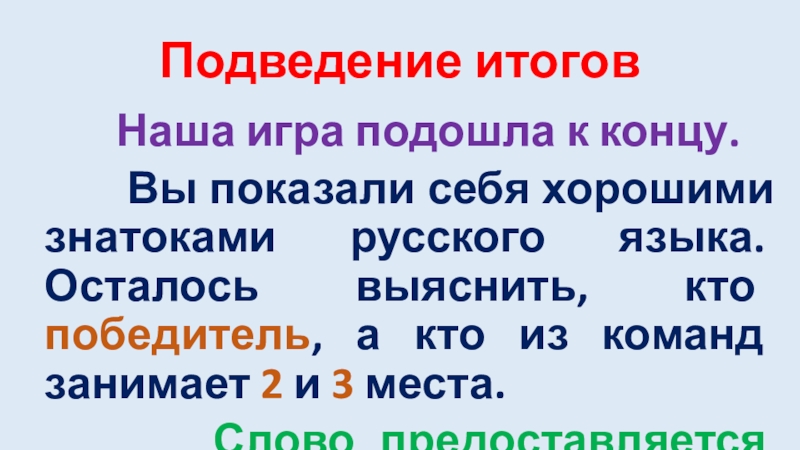 Вы показали себя хорошими знатоками русского языка. Осталось выяснить, кто победитель, а кто из команд занимает 2 и 3 места.