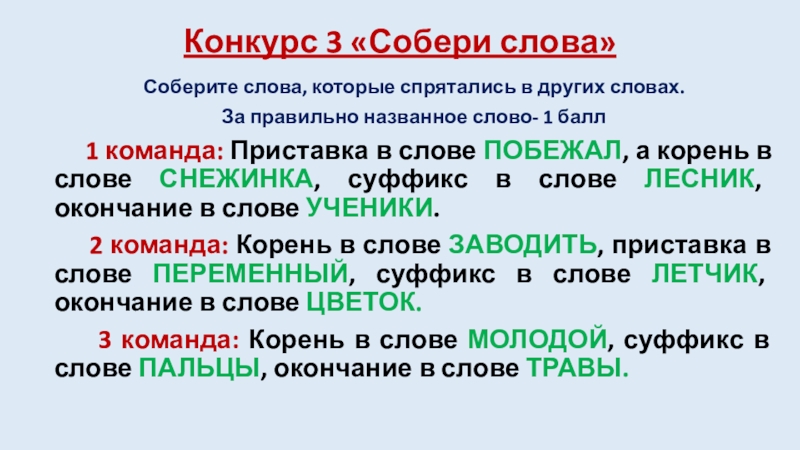 1 команда: Приставка в слове ПОБЕЖАЛ, а корень в слове СНЕЖИНКА, суффикс в слове ЛЕСНИК, окончание в слове УЧЕНИКИ.