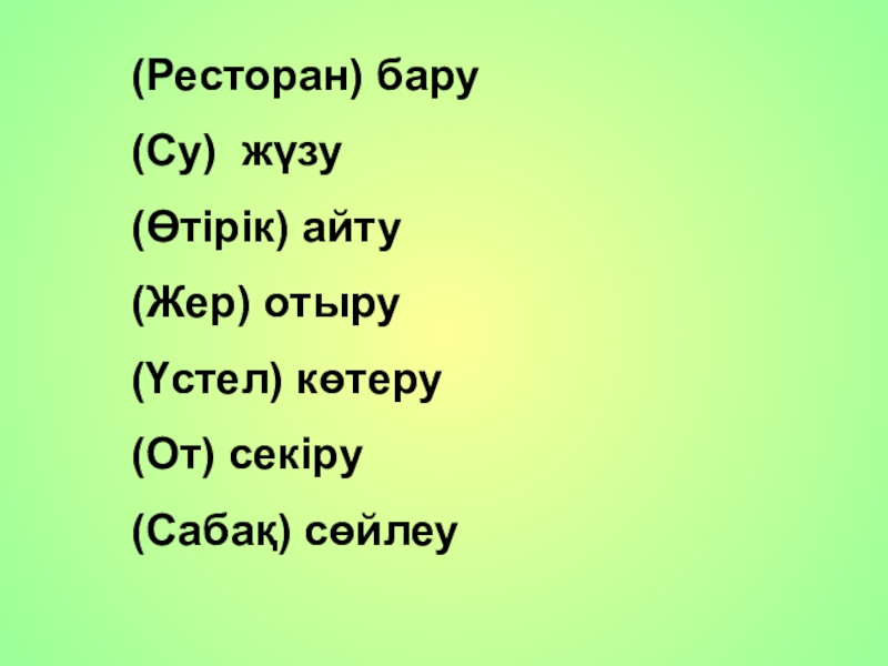 (Ресторан) бару(Су) жүзу(Өтірік) айту(Жер) отыру(Үстел) көтеру(От) секіру(Сабақ) сөйлеу