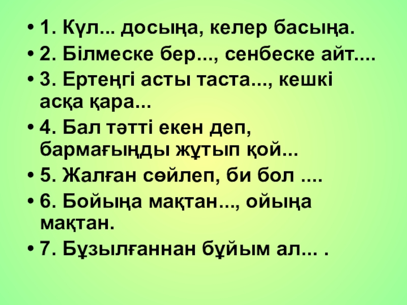 1. Күл... досыңа, келер басыңа.2. Білмеске бер..., сенбеске айт.... 3. Ертеңгі асты таста..., кешкі асқа қара...4. Бал