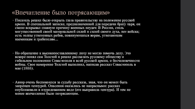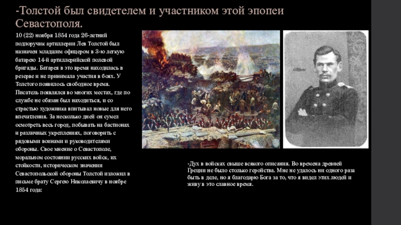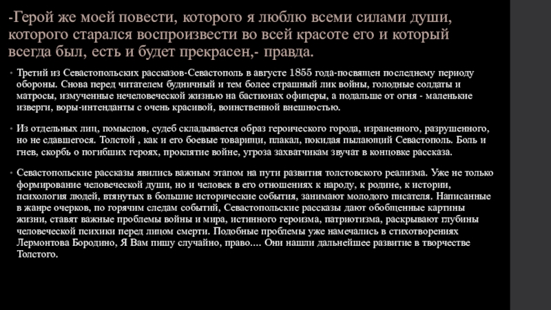Севастопольские рассказы явились важным этапом на пути развития толстовского реализма. Уже не только формирование человеческой души, но и человек в его отношениях к народу, к родине, к истории, психология людей, втянутых в большие исторические события, занимают молодого писателя. Написанные в жанре очерков, по горячим следам событий, Севастопольские рассказы дают обобщенные картины жизни, ставят важные проблемы войны и мира, истинного героизма, патриотизма, раскрывают глубины человеческой психики перед лицом смерти. Подобные проблемы уже намечались в стихотворениях Лермонтова Бородино, Я Вам пишу случайно, право.... Они нашли дальнейшее развитие в творчестве Толстого.