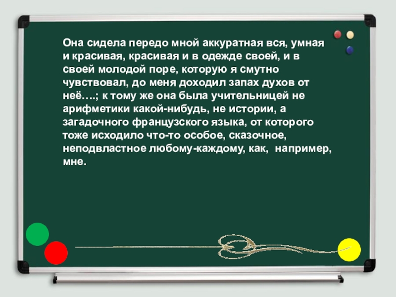 в одежде своей, и в своей молодой поре, которую я смутно чувствовал, до меня доходил запах духов от неё….; к тому же она была учительницей не арифметики какой-нибудь, не истории, а загадочного французского языка, от которого тоже исходило что-то особое, сказочное, неподвластное любому-каждому, как, например, мне.