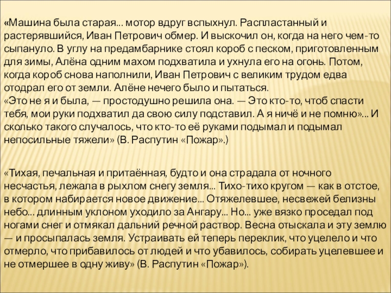 Слайд 19«Машина была старая... мотор вдруг вспыхнул. Распластанный и