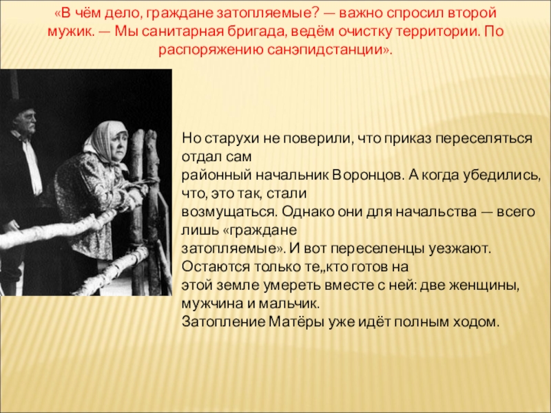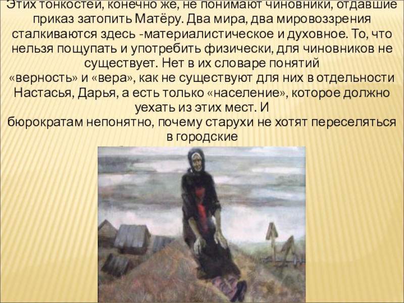 Слайд 12Этих тонкостей, конечно же, не понимают чиновники, отдавшие приказ затопить Матёру.