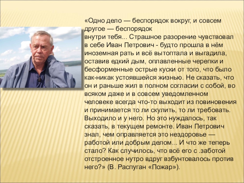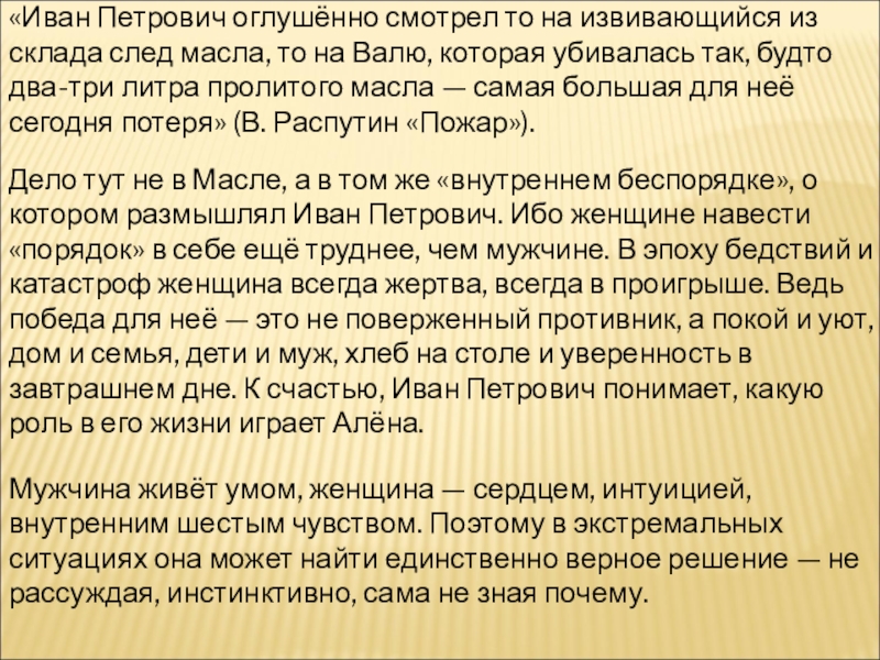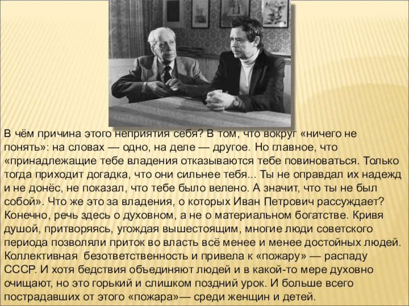 не понять»: на словах — одно, на деле — другое. Но главное, что «принадлежащие тебе владения отказываются тебе повиноваться. Только тогда приходит догадка, что они сильнее тебя... Ты не оправдал их надежд и не донёс, не показал, что тебе было велено. А значит, что ты не был собой». Что же это за владения, о которых Иван Петрович рассуждает? Конечно, речь здесь о духовном, а не о материальном богатстве. Кривя душой, притворяясь, угождая вышестоящим, многие люди советского периода позволяли приток во власть всё менее и менее достойных людей. Коллективная безответственность и привела к «пожару» — распаду СССР. И хотя бедствия объединяют людей и в какой-то мере духовно очищают, но это горький и слишком поздний урок. И больше всего пострадавших от этого «пожара»— среди женщин и детей.