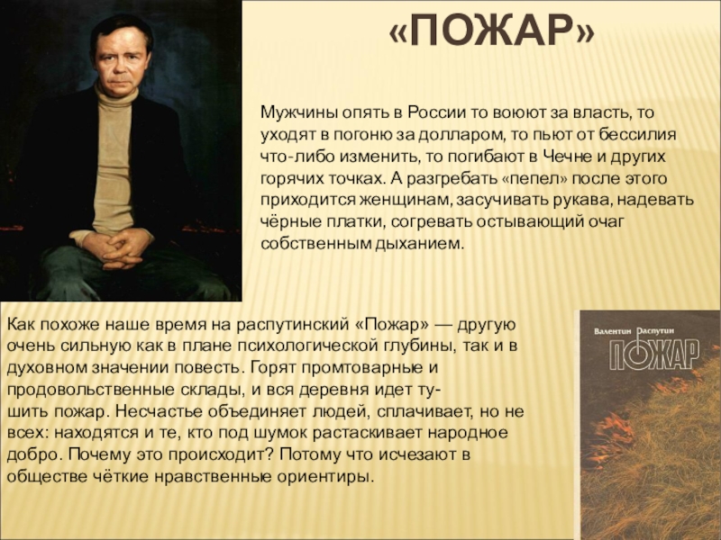 Как похоже наше время на распутинский «Пожар» — другую очень сильную как в плане психологической глубины, так и в духовном значении повесть. Горят промтоварные и продовольственные склады, и вся деревня идет ту-