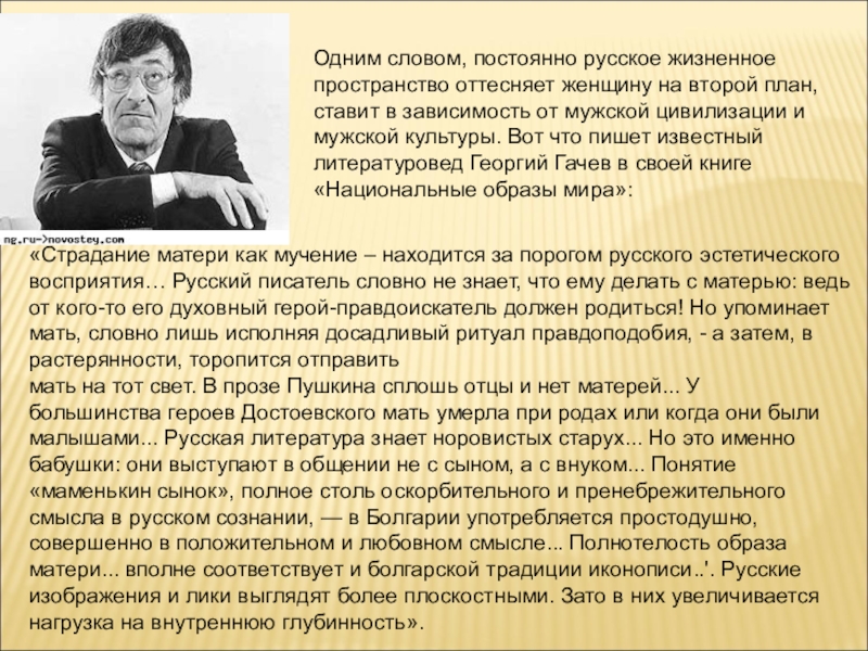 ставит в зависимость от мужской цивилизации и мужской культуры. Вот что пишет известный литературовед Георгий Гачев в своей книге «Национальные образы мира»: