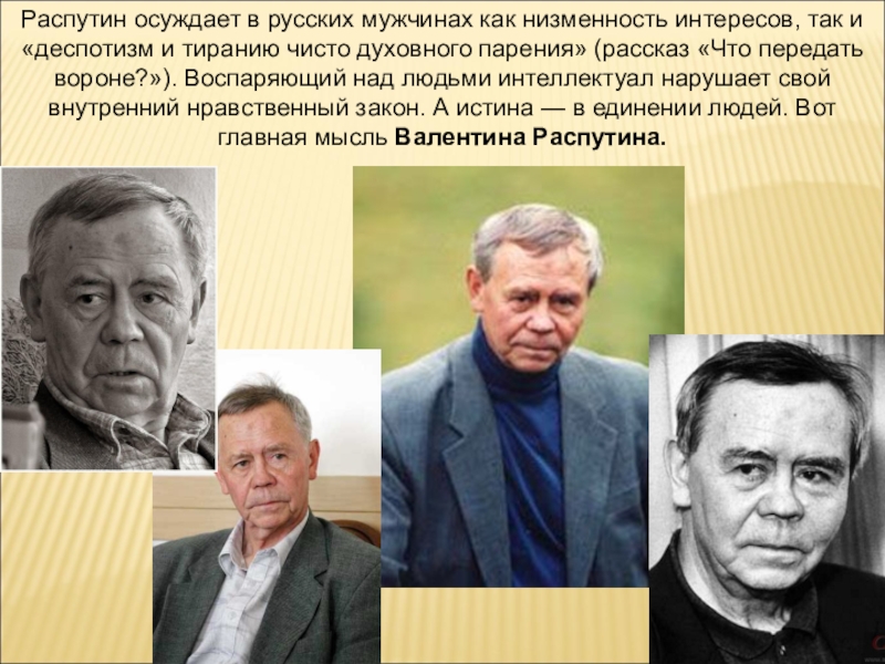 Слайд 24Распутин осуждает в русских мужчинах как низменность интересов, так и