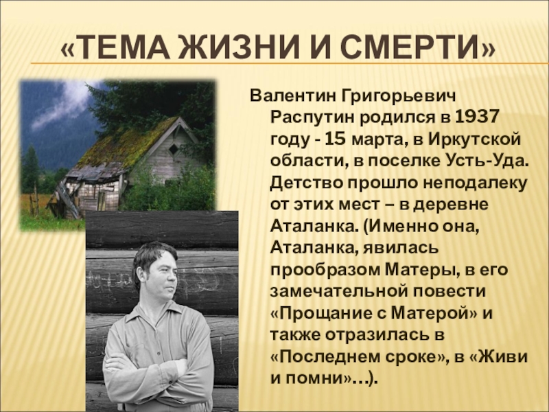 15 марта, в Иркутской области, в поселке Усть-Уда. Детство прошло неподалеку от этих мест – в деревне Аталанка. (Именно она, Аталанка, явилась прообразом Матеры, в его замечательной повести «Прощание с Матерой» и также отразилась в «Последнем сроке», в «Живи и помни»…).