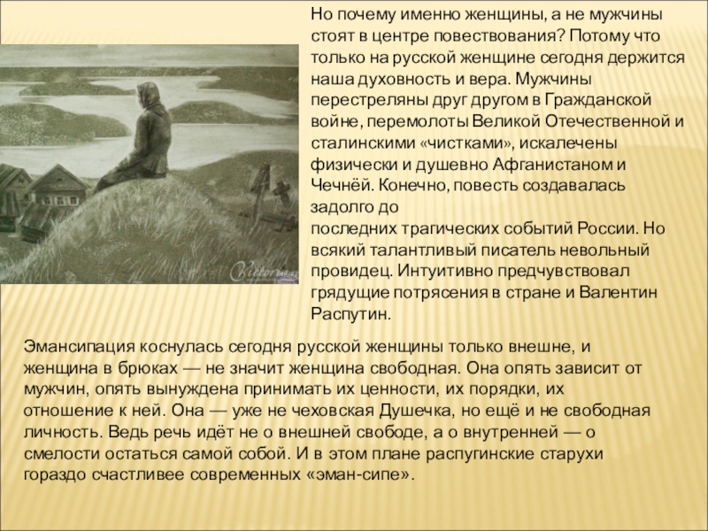 Потому что только на русской женщине сегодня держится наша духовность и вера. Мужчины перестреляны друг другом в Гражданской войне, перемолоты Великой Отечественной и сталинскими «чистками», искалечены физически и душевно Афганистаном и Чечнёй. Конечно, повесть создавалась задолго до