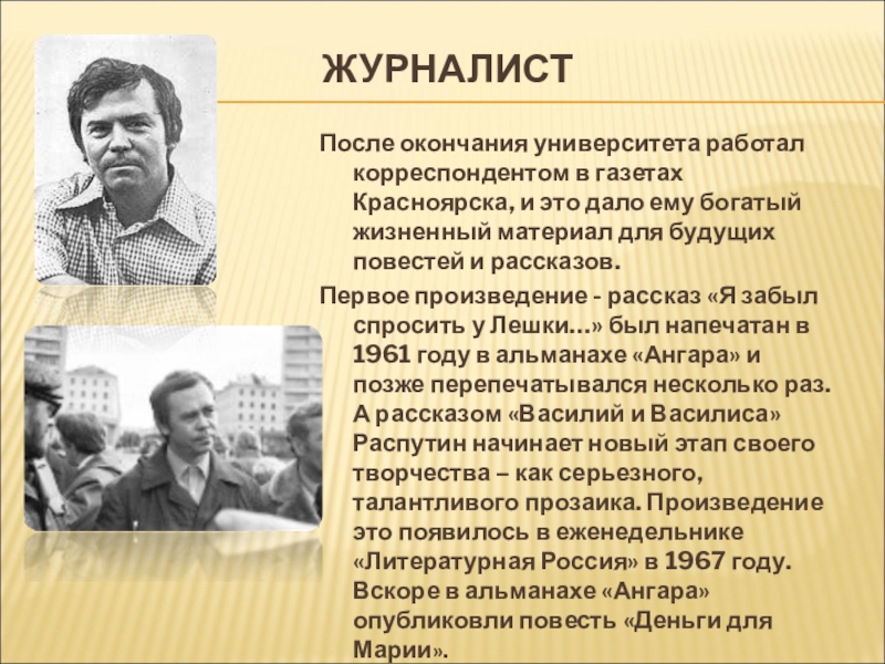 Первое произведение - рассказ «Я забыл спросить у Лешки…» был напечатан в 1961 году в альманахе «Ангара» и позже перепечатывался несколько раз. А рассказом «Василий и Василиса» Распутин начинает новый этап своего творчества – как серьезного, талантливого прозаика. Произведение это появилось в еженедельнике «Литературная Россия» в 1967 году. Вскоре в альманахе «Ангара» опубликовли повесть «Деньги для Марии».