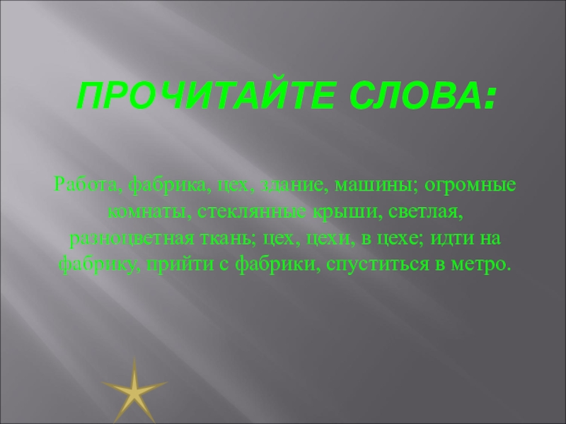 ПРОЧИТАЙТЕ СЛОВА:Работа, фабрика, цех, здание, машины; огромные комнаты, стеклянные крыши, светлая, разноцветная ткань; цех, цехи, в цехе;