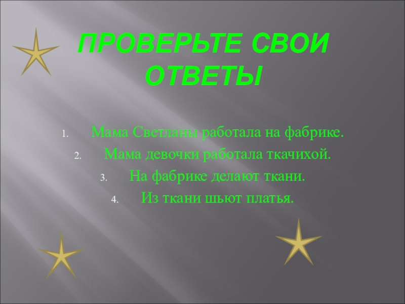 ПРОВЕРЬТЕ СВОИ ОТВЕТЫМама Светланы работала на фабрике.Мама девочки работала ткачихой.На фабрике делают ткани.Из ткани шьют платья.