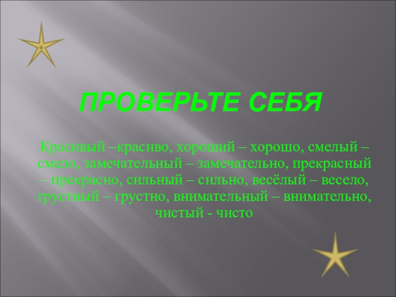 ПРОВЕРЬТЕ СЕБЯКрасивый –красиво, хороший – хорошо, смелый – смело, замечательный – замечательно, прекрасный – прекрасно, сильный –