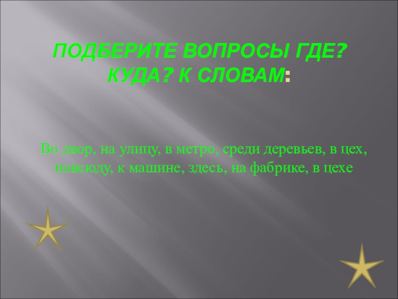 ПОДБЕРИТЕ ВОПРОСЫ ГДЕ? КУДА? К СЛОВАМ: Во двор, на улицу, в метро, среди деревьев, в цех, повсюду,