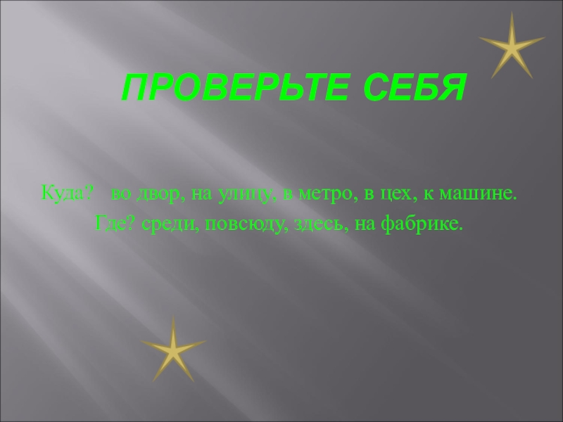 ПРОВЕРЬТЕ СЕБЯКуда?  во двор, на улицу, в метро, в цех, к машине.Где? среди, повсюду, здесь, на